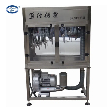 答:1、針對貼標(biāo)前的干燥要求進(jìn)行設(shè)計(jì),采用專利設(shè)計(jì)風(fēng)刀,把高速風(fēng)引致玻璃瓶表面,快速切除水份,以更低功率(高壓鼓風(fēng)機(jī)配合風(fēng)刀—···